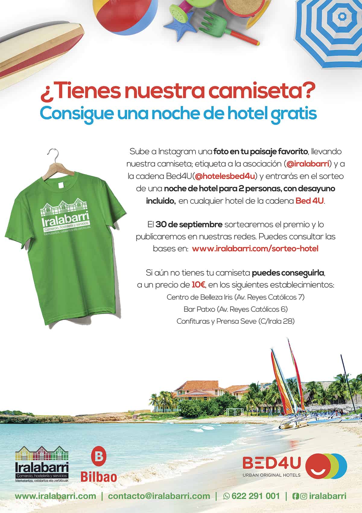 Si tienes la camiseta de nuestra asociación estás de enhorabuena. Iralaberri y Hoteles Bed4U vamos a sortear una noche de hotel para dos personas, con desayuno incluido, en cualquiera de los establecimientos de la cadena. Para participar sólo tienes que fotografiarte con la camiseta en tu paisaje favorito y subir la instatánea a Instagram etiquetándonos a la asociación (@iralaberri) y a la cadena Bed4U (@hotelesBed4U).